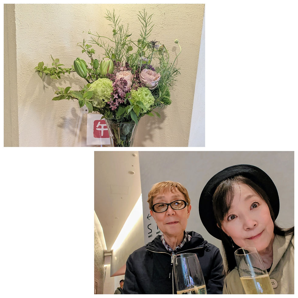 最後に昨日トムちゃんと美奈子ちゃんからもらったお花とお芝居が始まる前にスパークリングワインで乾杯してる礼ちゃん😎との2ショット。