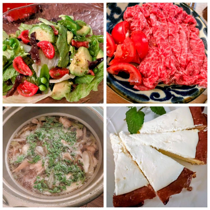 サラダとメインの木の芽牛しゃぶ。京都から届いた木の芽のおかげで今木の芽長者なのです。😊デザートはあっちゃんのチーズケーキを解凍したもの。